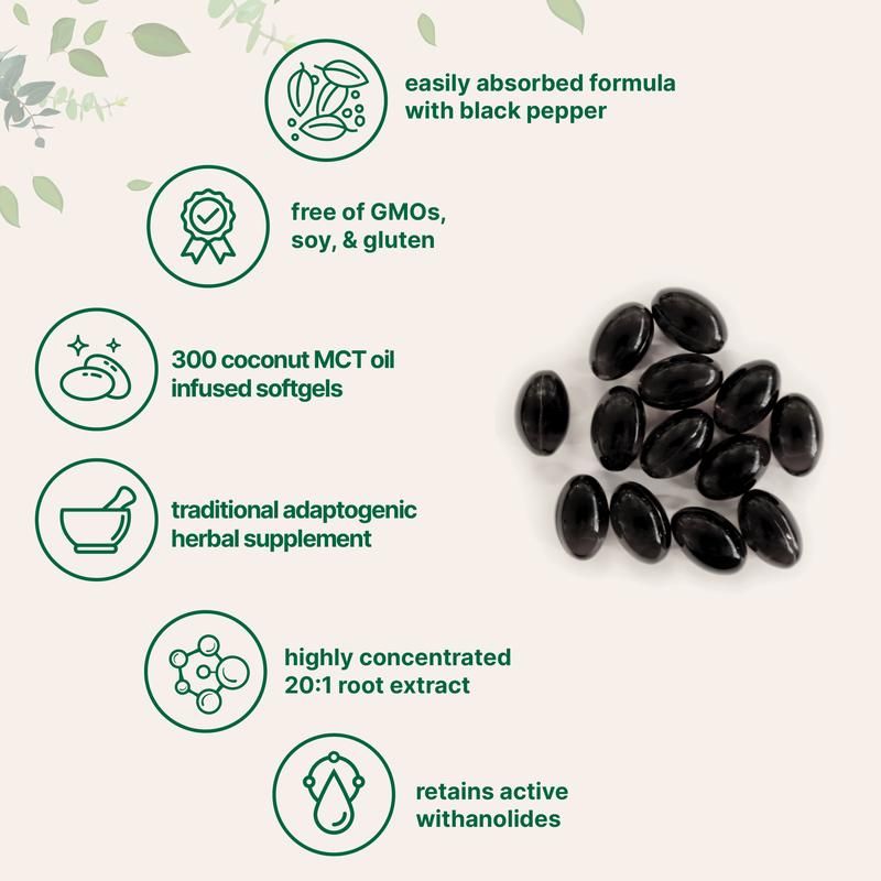 ·Each pouch contains 300 softgels with 150 servings. Delivers a 6,000mg serving of Ashwagandha as Withania Somnifera combined with Black Pepper and Coconut MCT Oil.
